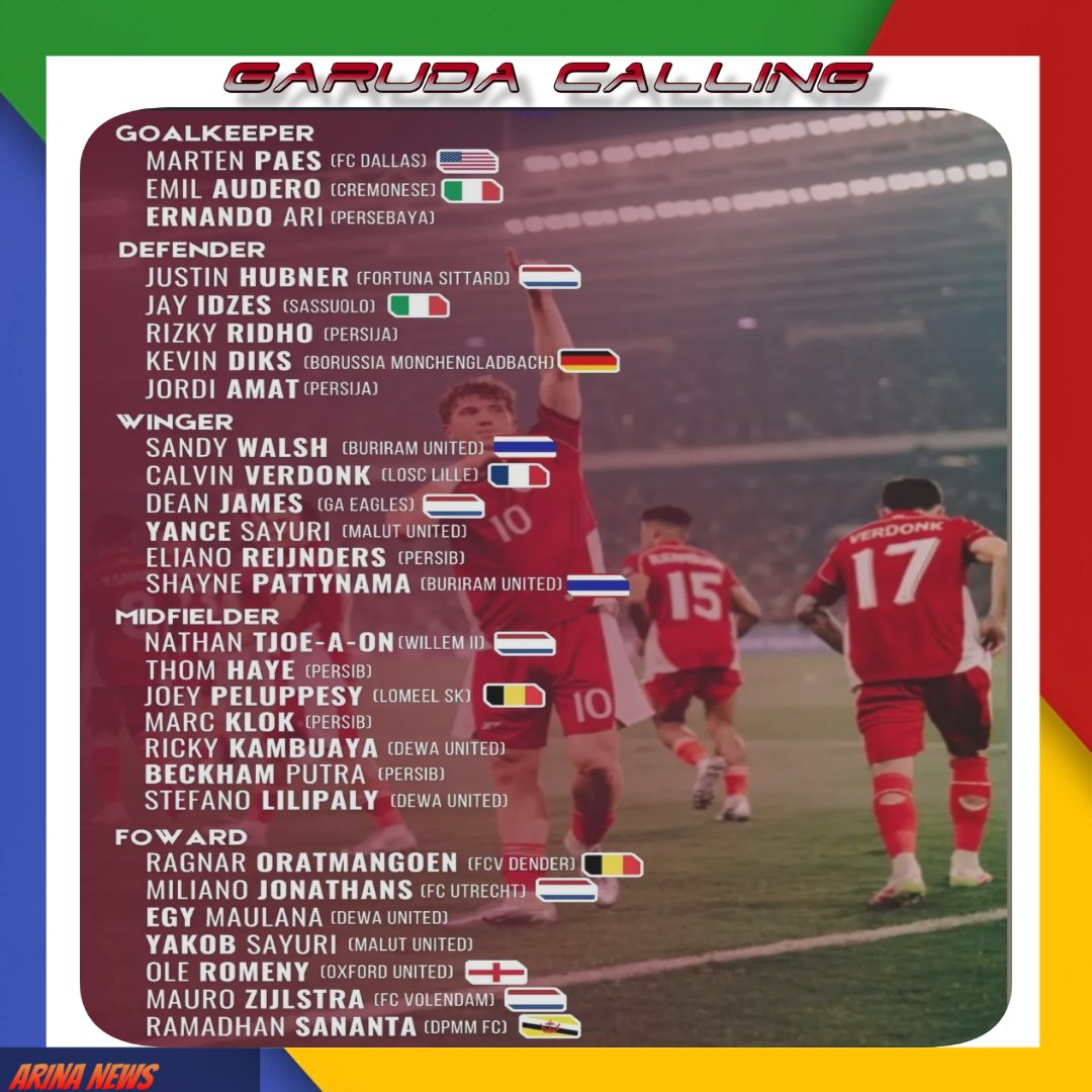 Arina News, Timnas Indonesia resmi mengumumkan daftar pemain untuk Putaran 4 Kualifikasi Piala Dunia 2026 yang akan digelar pada Oktober mendatang. Skuad Garuda dipanggil untuk menghadapi Arab Saudi dan Irak dalam upaya membawa Indonesia menembus putaran final Piala Dunia 2026.